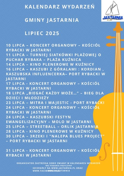 Organizatorzy zastrzegają sobie prawo do zmian w kalendarzu wydarzeń bez podania przyczyny. Szczegółowe informacje na temat poszczególnych imprez można znaleźć na stronie internetowej www.jastarnia.pl oraz na profilu Facebook Gminy Jastarnia: www.facebook.com/jastarnia
