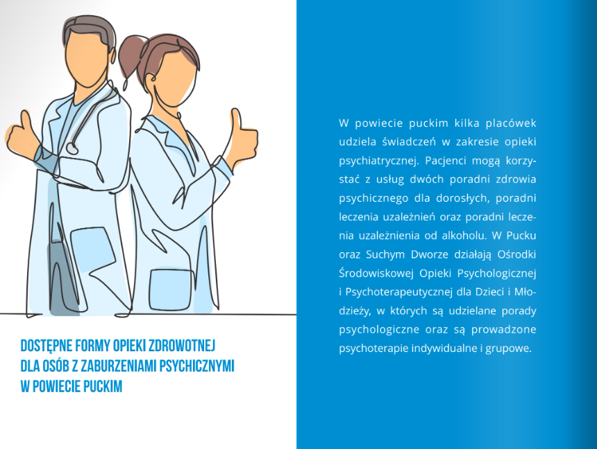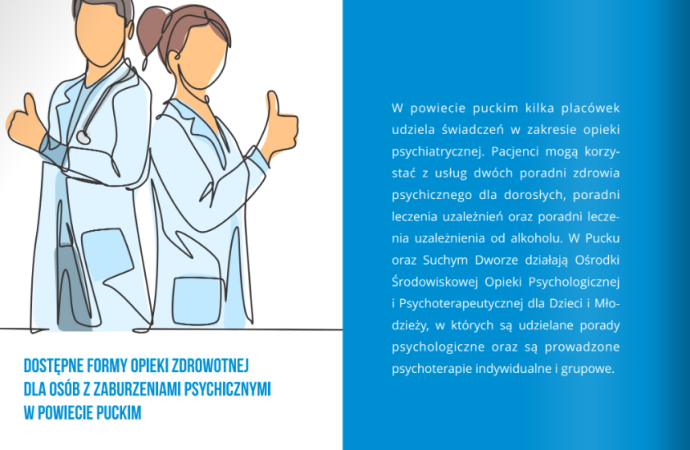 Poradnik wydany przez Starostwo Powiatowe w Pucku zawiera kompleksowe informacje o dostępnych formach opieki zdrowotnej, pomocy społecznej i aktywizacji zawodowej dla osób z zaburzeniami psychicznymi na terenie powiatu. Znajdziemy w nim: