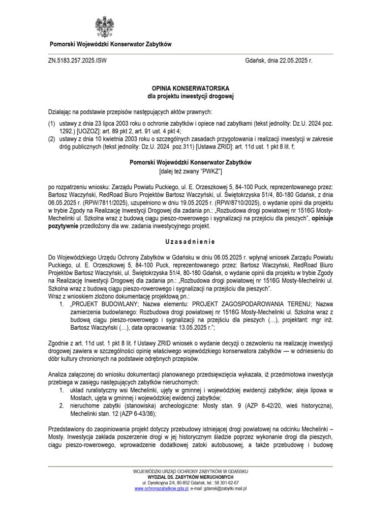 Dzięki pozytywnej opinii, Zarząd Dróg Powiatowych w Pucku może kontynuować prace projektowe i przygotowania do realizacji inwestycji.