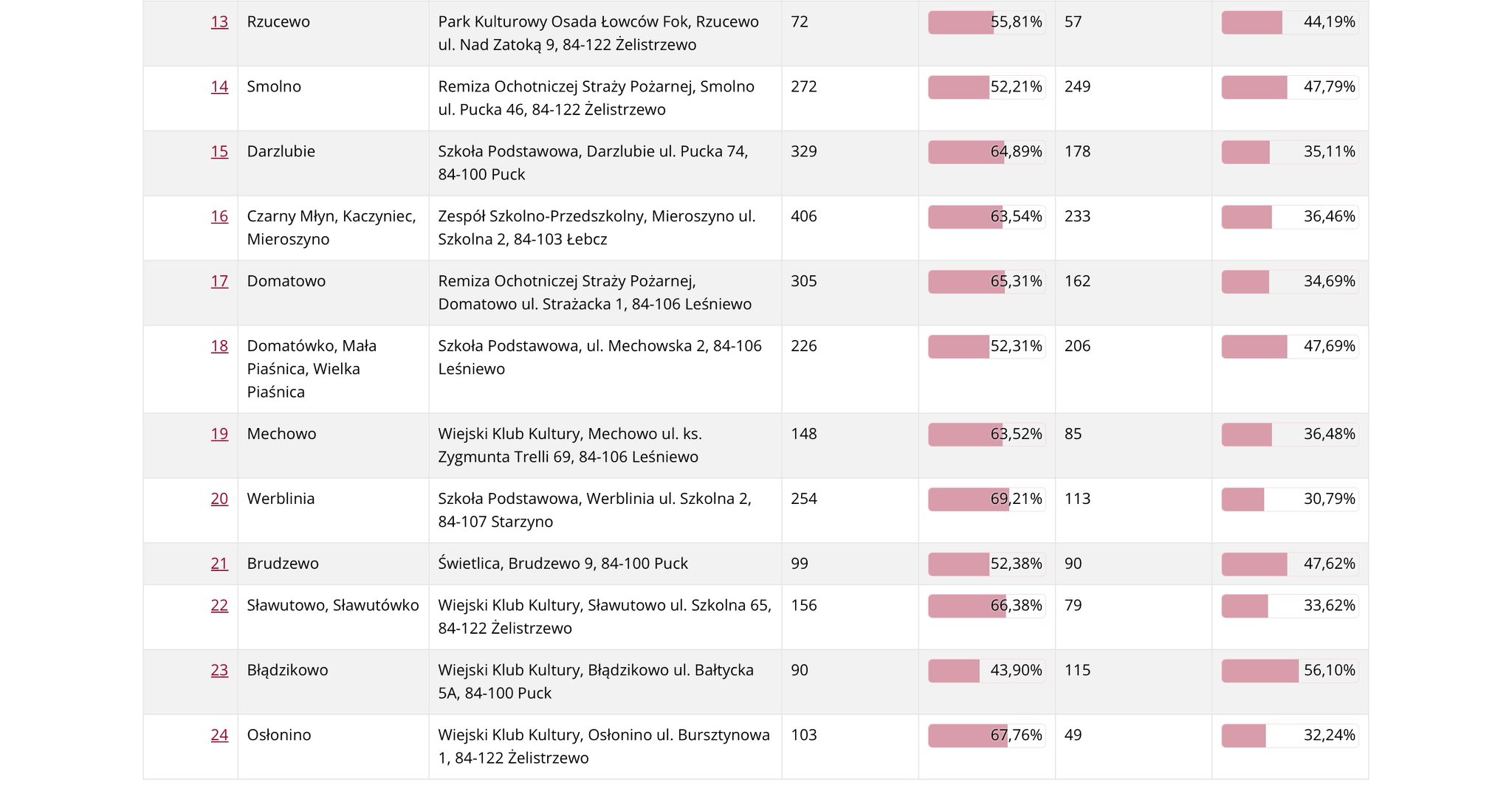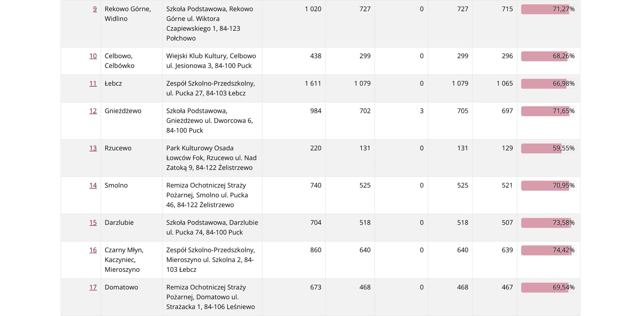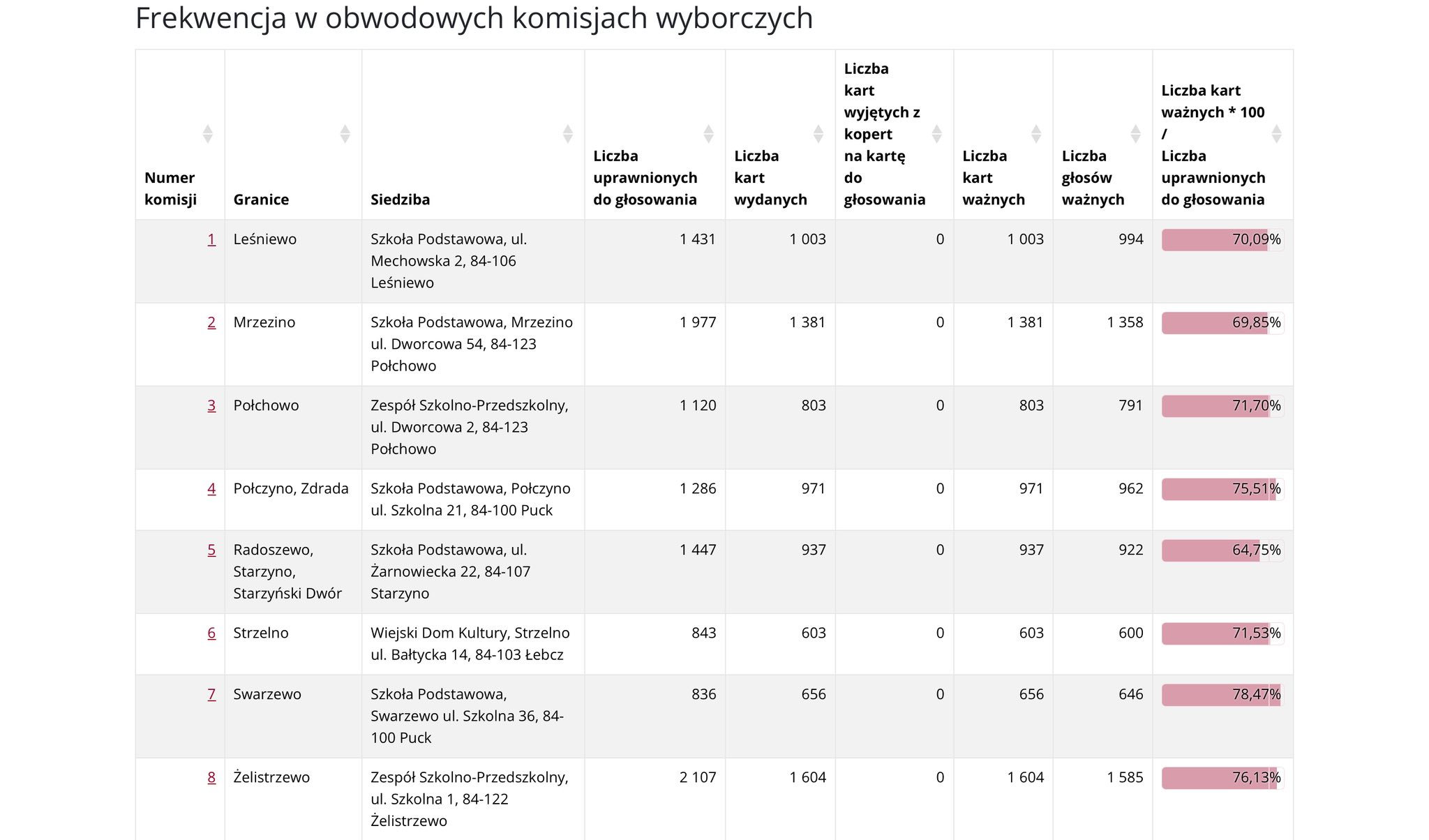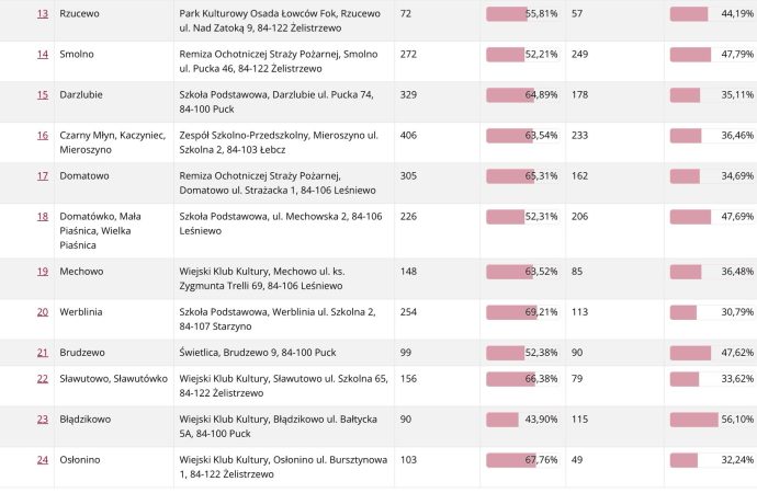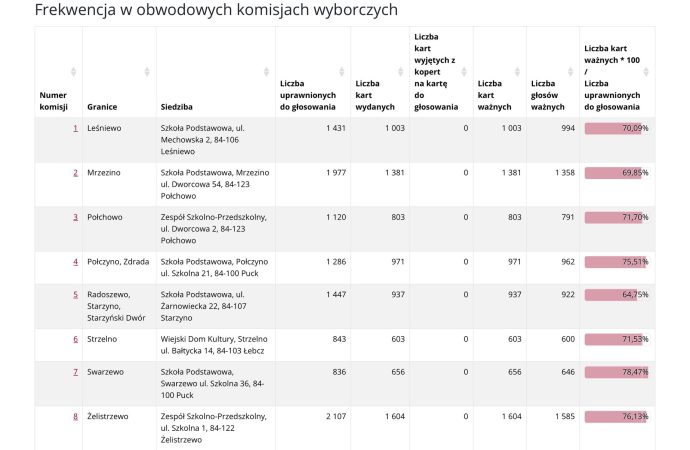 Gmina Puck zajęła piąte miejsce w powiecie puckim pod względem frekwencji, która wyniosła 76,27%. Poniżej prezentujemy szczegółowe dane dla poszczególnych gmin: