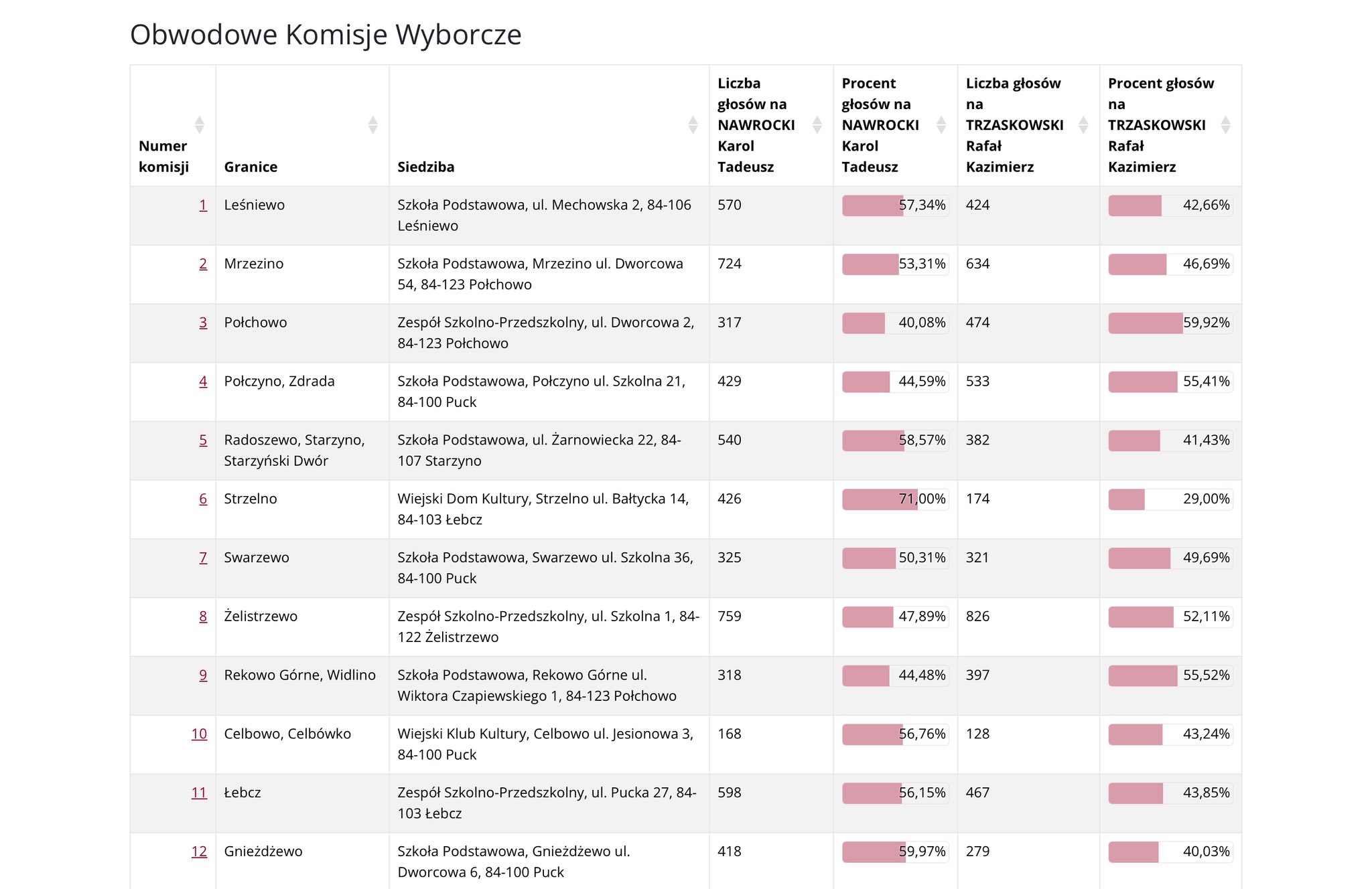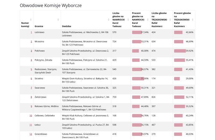 Karol Nawrocki wygrał w gminach wiejskich Puck i Krokowa, natomiast Rafał Trzaskowski zwyciężył w pozostałych gminach, w tym w miastach powiatu.