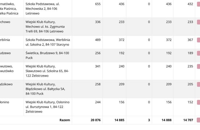 Nawet sołectwa, którym nie udało się osiągnąć minimalnego progu 65%, otrzymają dofinansowanie w wysokości 1000 zł. Dotyczy to Osłonina, Rzucewa, Starzyna, Starzyńskiego Dworu i Radoszewa.